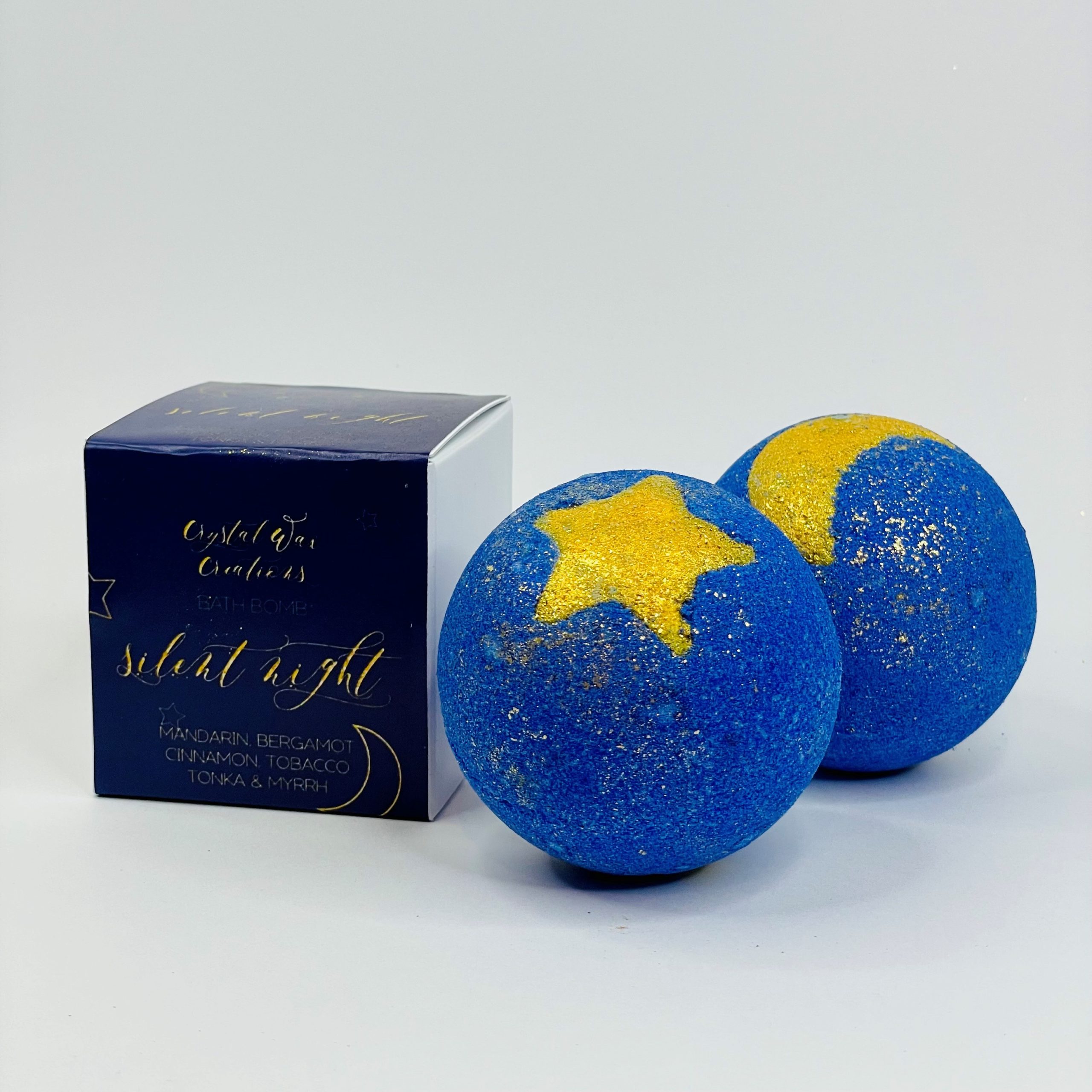 Our Silent Night bath bombs will turn your bath water a beautiful deep blue-purple colour with streaks of yellow & gold sparkles. Each Bath Ball weighs approximately 120g and comes packaged in a biodegradable bag & gift box, perfect for gifting!